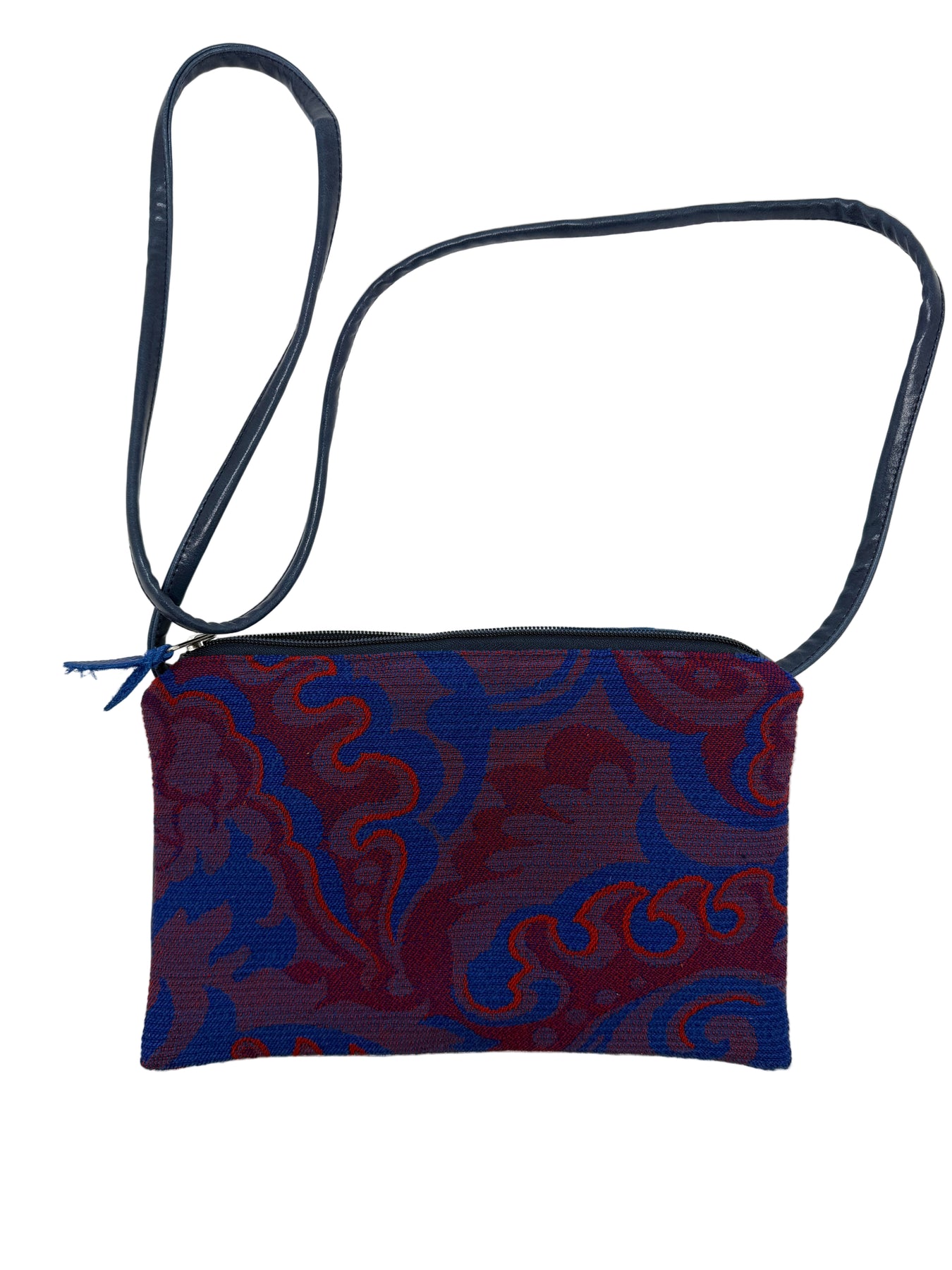 Small crossbody bag in blue and red with blue and orange pattern on a white background vintage airplane fabric#color_western-airlines-paisley-blue-orange
