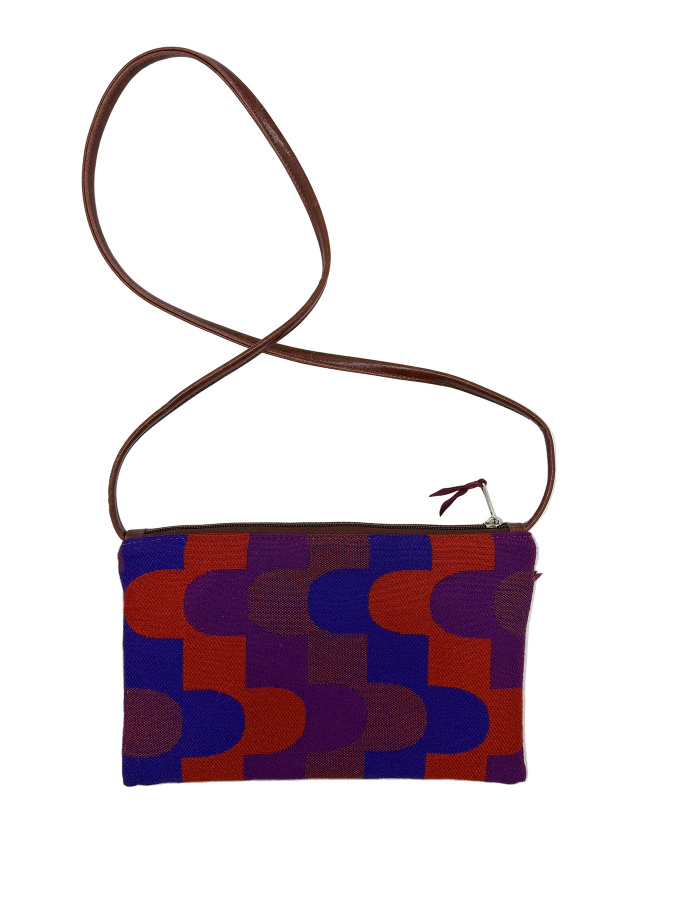 Patterned pouch with a brown strap on a white background#color_sky-arches-red-purple