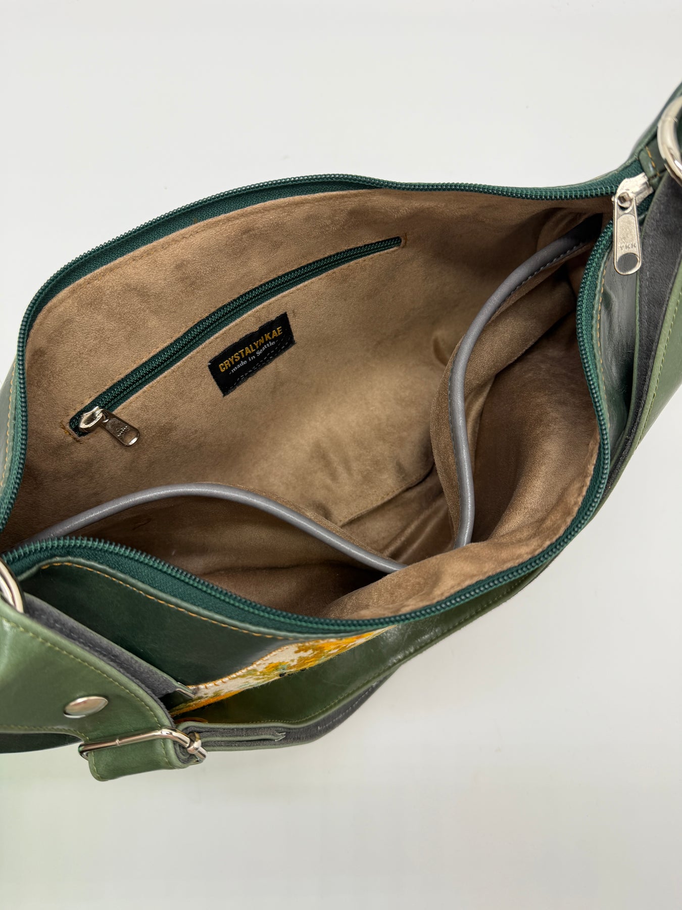 This Charleston Hobo is crafted in deep forest green coated canvas and finished with a one-of-a-kind floral appliqué, hand-embroidered over vintage fabric with french knots and satin stitch, and sewn in place to create a soft, painterly focal point.